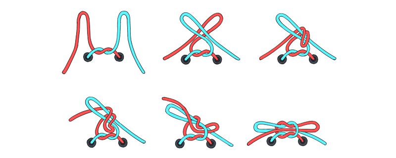 首先把两根绳子相互交叉打一个死结,再打一个活扣,接着将较长一端绕至活扣中间穿出,调整到松紧合适。还可以将两端末尾的绳子收回来,藏进活扣里,这一步结束后的图案有点像一朵四叶花。